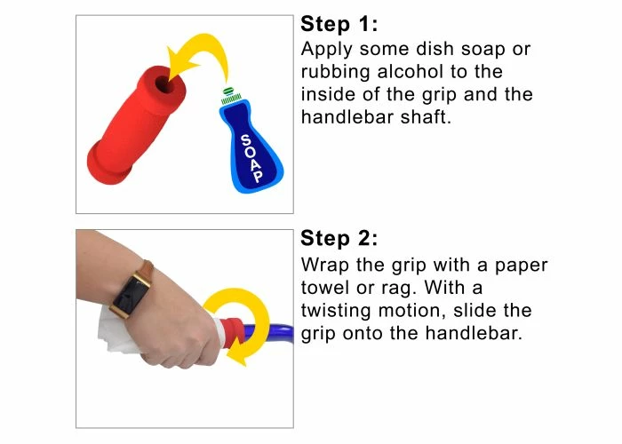 Note: These great little grips are a tight fit, but will easily slide onto the handlebar once you know the professional scooter mechanic’s secret.